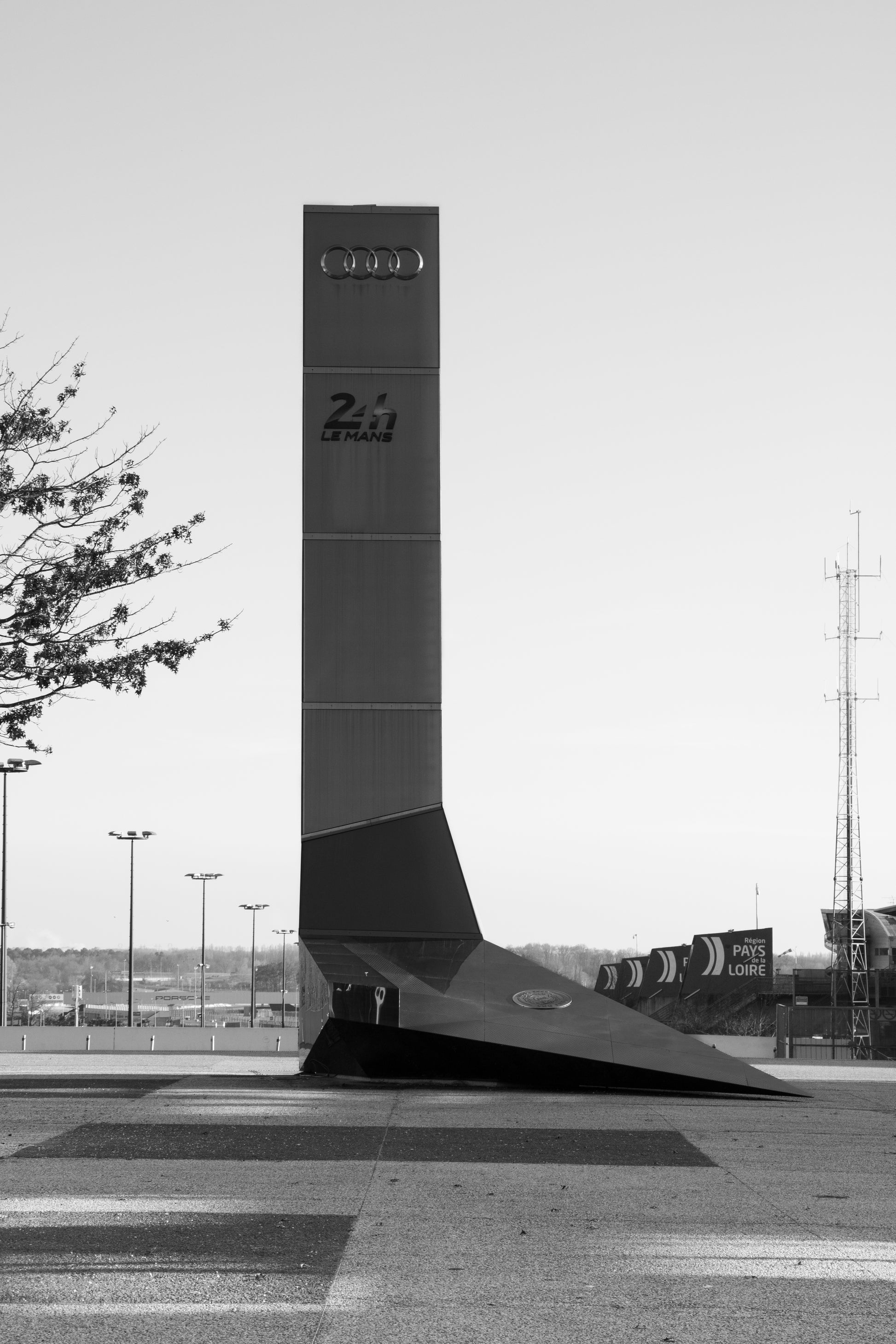 Photo du totem Audi situé dans l'enceinte du circuit des 24h du Mans, illustrant un L.